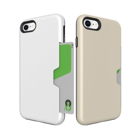 ポリウレタンとポリカーボネートの二層構造で本体を落下衝撃から守る耐衝撃性を備え、カード収納機能があります。