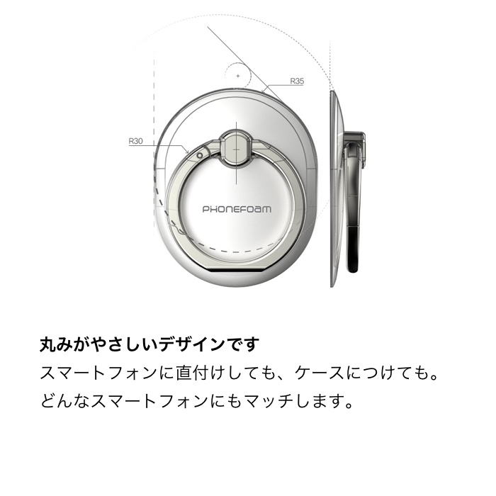 | その他 | 本製品は、スマートフォン本体やスマートフォンの背面に粘着フィルムで貼り付けて使用します。 シリコンやウレタン等の軟質の素材には使用できません。 また、凹凸のある面に使用することはできません。 ガラス素材への貼付はできません。iPhone 4sやXperia、Galaxyの一部機種ではスマートフォンケースの上からご利用ください。 |